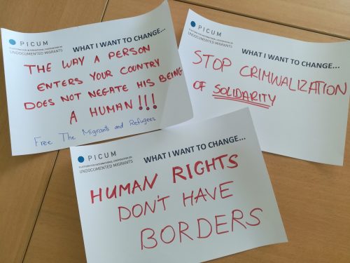 Photo: PICUM members had the opportunity to write their key demands and wishes for change on signs.