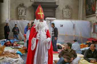 St. Nicholas visiting undocumented Afghan migrants staying in the Église du-Béguinage (Beguinage Church) on 8th December in Brussels, Belgium; an initiative of the local volunteer group CRER – Coordination Contre les Rafles, les Expulsions et pour la Régularisation (Coordination against raids and deportation and for regularization) to bring presents to undocumented migrant children.