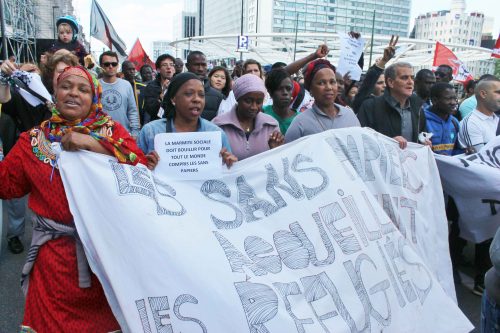Photo: Migrant women show a sign saying that undocumented migrants host and assist newly arrived refugees during a ‘Refugee Welcome’ protest in Brussels on 27 September 2015 which gathered around 20,000 supporters. ©Elisabeth Schmidt-Hieber